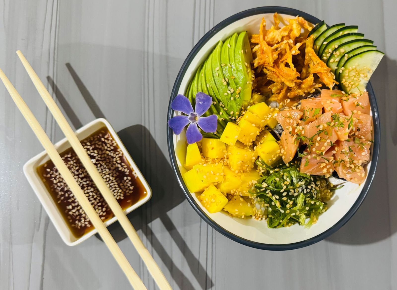 Tartar salmón con mezcla de mayonesa japonesa, acompañado arroz sushi, Aguacate, zanahoria crocante, ajonjolí, pepino encurtido,Ensalada algas, mango. Acompañado de salsa ponzu.