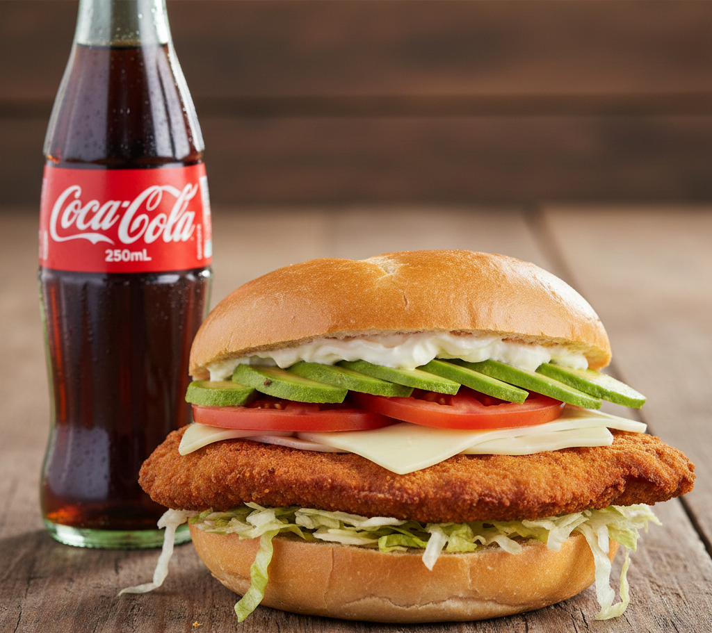 Milanesa de res apanada, sour cream, lechuga, tomate, aguacate, queso y elige tu gaseosa 250 ml ( quatro o cocacola).