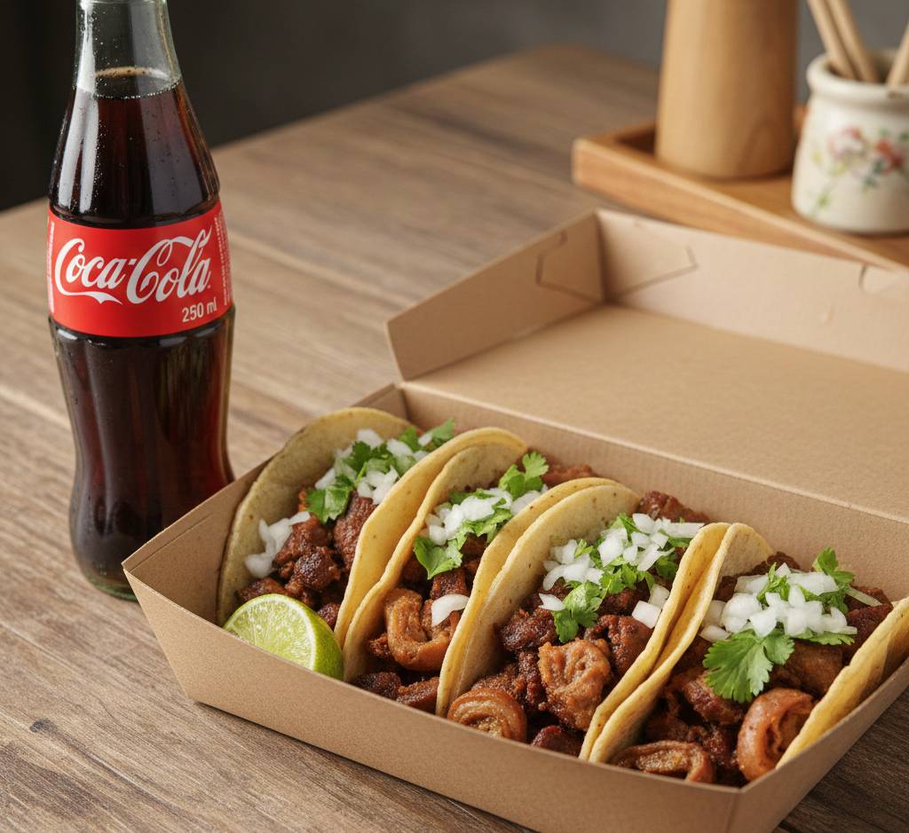 Taco pastor (carne al pastor, cebolla, cilantro) y taco pollo ( pechuga, cebolla, cilantro) y elige tu gaseosa 250 ml ( quatro o cocacola)