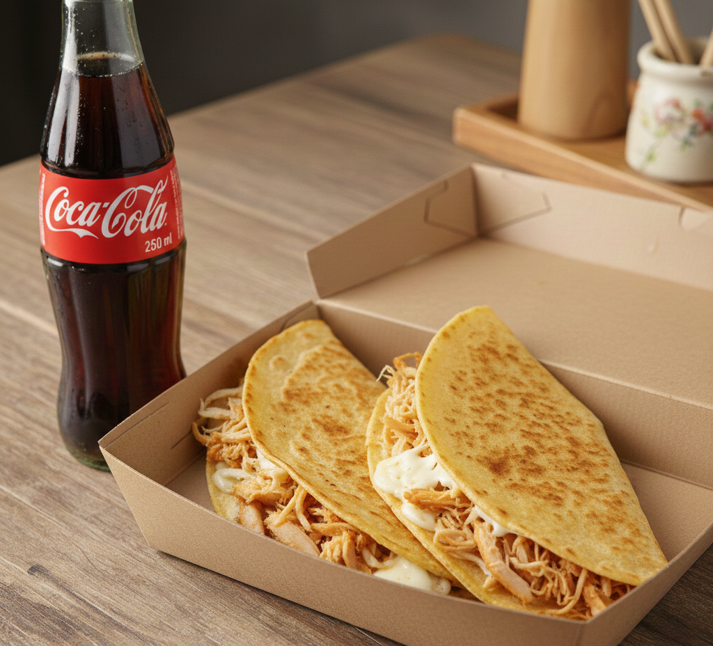 Tortilla de maíz, res asada, queso y elige tu gaseosa 250 ml ( quatro o cocacola).