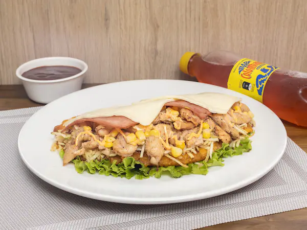 Patacon con queso doble crema, jamon, pollo,papa cabello de angel, maiz tierno y bebida de 400 ml a eleccion