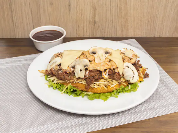 Combinación de carne desmechada y pollo con champiñones, cubierto con queso doble crema fundido o con queso costeño..