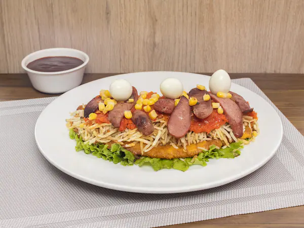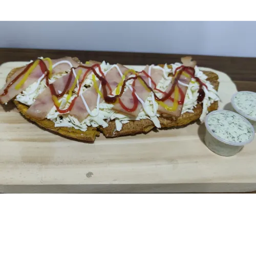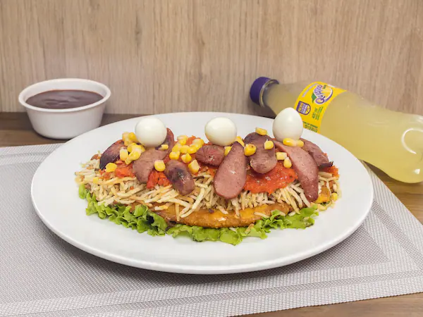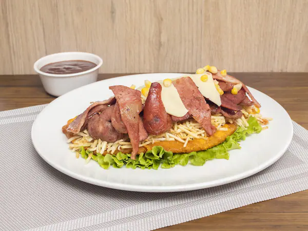 Patacón, maíz, chorizo, salchicha, tocineta y queso doble crema rallado.