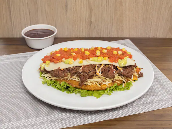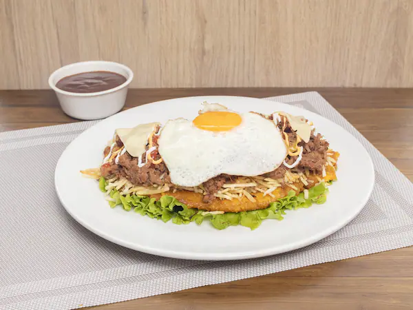 Contiene patacón con carne de res en salsa BBQ y huevo frito.