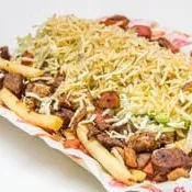 Papas francesas con chorizo parrillero, tocineta y maiz