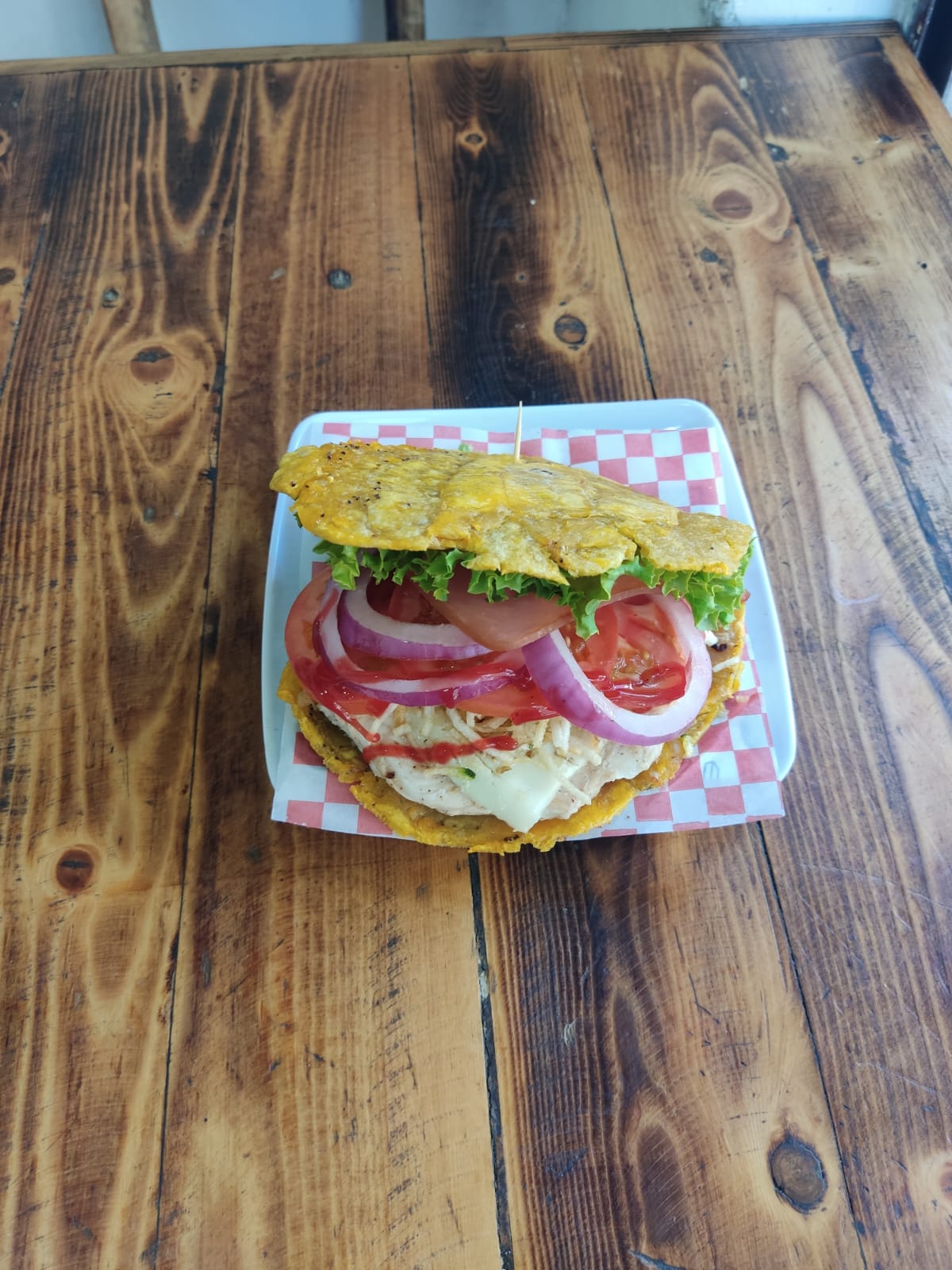 patacon estilo burguer con 120 gramos de pechuga de pollo papas fosforito queso mozzarella , vegetales y salsa de la casa