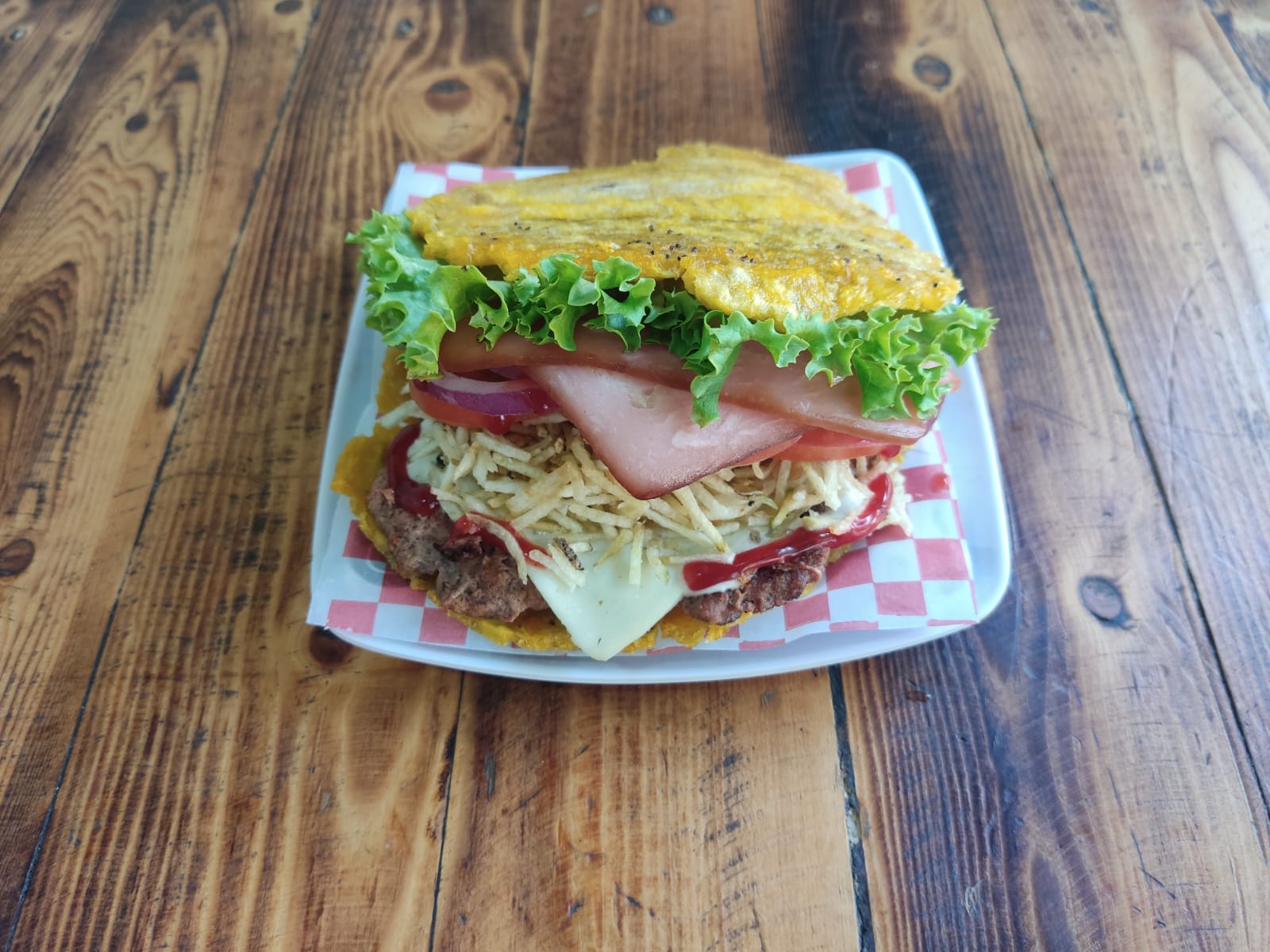 Patacon estilo hamburguesa con 100 gramos de carne de res artesanal , doble porcion de jamon vegetales y salsas de la casa