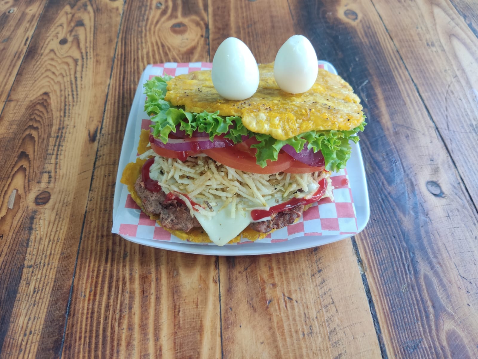 patacon estilo hamburguesa con 100 gramos de carne de res artesanal, dos huevos de codorniz ,vegetales y salsa de la casa
