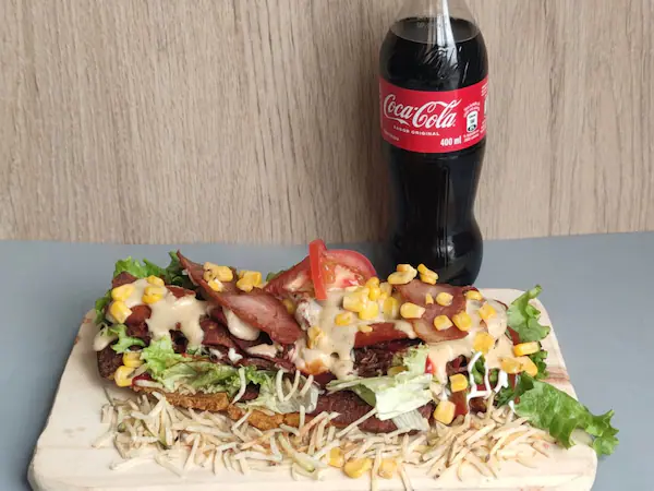 Contiene patacón, estilo burger con carne de res, jamón, lechuga, tomate, cebolla grillé y queso mozzarella.