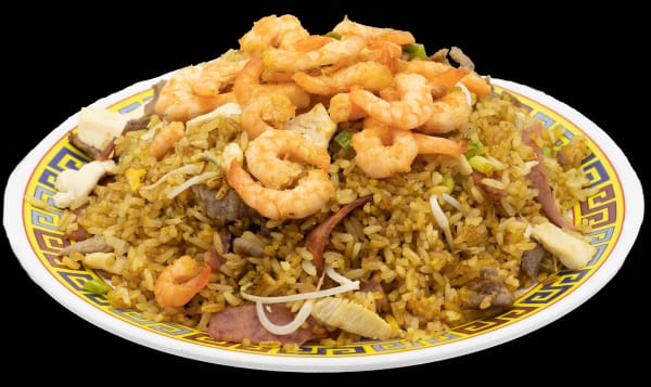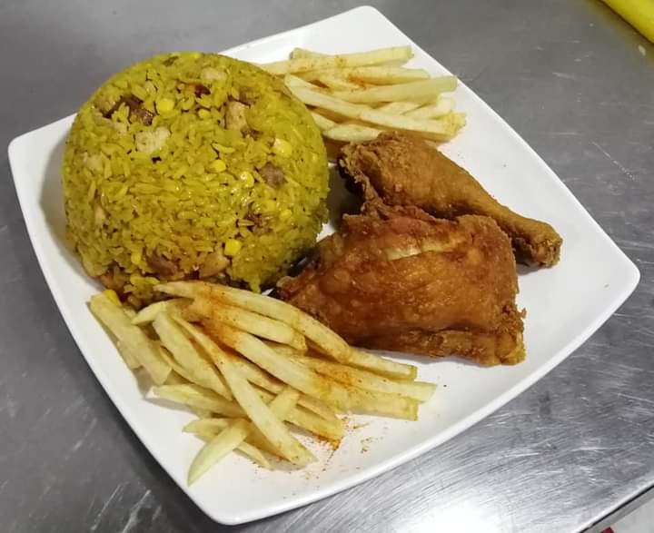 Arroz tradicional 2 personas (pollo, cerdo, chicharrón, plátano y maíz tierno), 1/4 pollo frito, francesa y gaseosa 1.5 L sabor a elección.