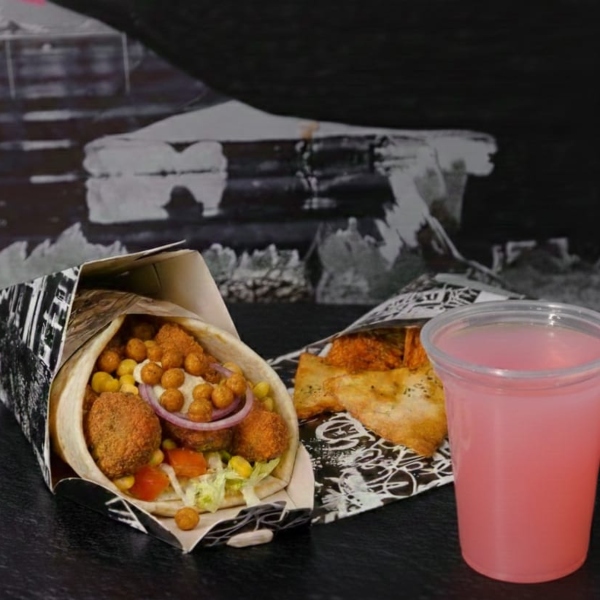 2 Proteínas (1 Falafel Vegetariano y Pollo Crispy) con Maduro, Maíz, Garbanzo Tostado, Hummus y Cebolla Encurtida en Base Pan árabe, Lechuga, Tomate, White Sauce, Porción de Chips y Bebida a Elección.