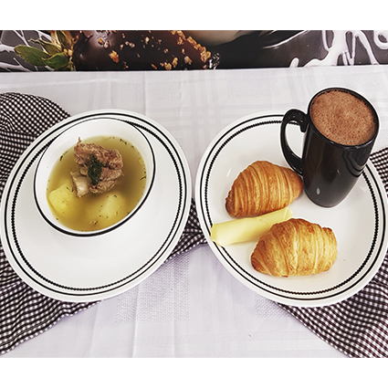 Caldo de Costilla*1 + Chocolate 9 oz*1 + Pan Pequeño*2 + Porción de Queso*1