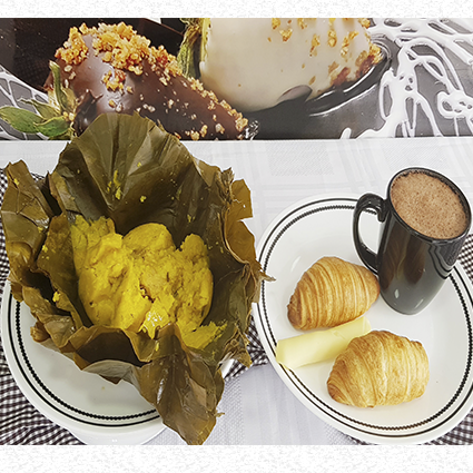 Combo de tamal, chocolate 9 oz, 2 panes y porción de queso.
