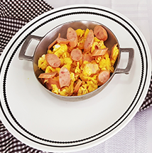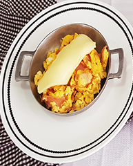 Huevos rancheros (salchicha ranchera, mazorca, jamón, queso).
