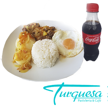 Moñona (porción de arroz, papa sudada, came bistec, huevo al gusto), gaseosa coca cola 250 ml.