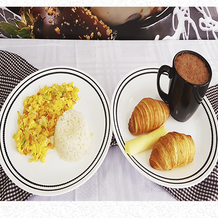 Huevos al Gusto*1 + Porción de Arroz*1 + Chocolate 9 oz*1 + Pan Pequeño*2 + Porción de Queso*1