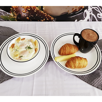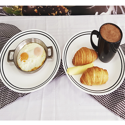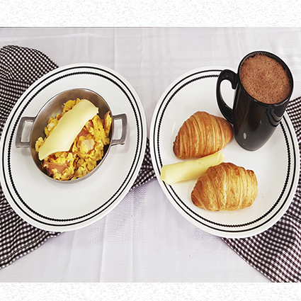 Huevos al Gusto*1 + Chocolate 9 oz*1 + Pan Pequeño*2 + Porción de Queso*1