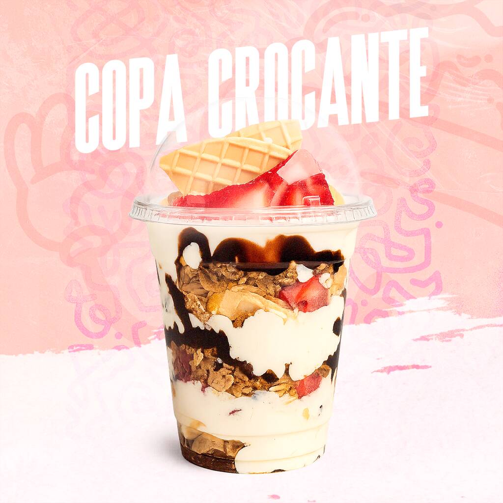 Sumérgete en una experiencia de sabor y textura inolvidable. Nuestra Copa Crocante combina la frescura de tu fruta favorita con la dulzura de una suave salsa chantilly, todo sobre una base de obleas crujientes. Personaliza tu postre ideal con una selección de fruta, un topping y una salsa a tu elección. Es el postre perfecto para cualquier momento del día.
