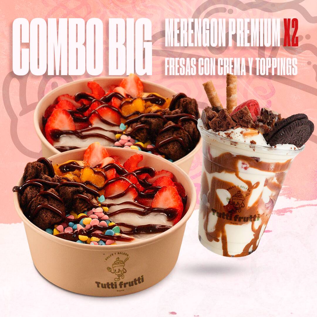 Combo BIG: ¡Comparte y disfruta! Incluye 2 Merengones Premium y 1 Fresas con Crema con toppings. ¡Ideal para dos personas!