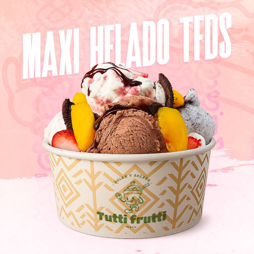 MAXI HELADO •🍨 5 porciones de helado • 🍓 Frutas picadas: fresa, pera, papaya, banano • 💥 Merengue crocante • 🍫 Salsa chantilly, mora y chocolate ¡Grande, Real y Antojable!