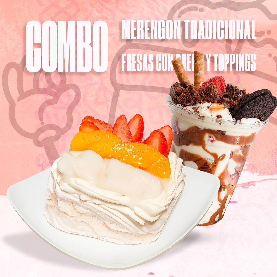 ¡Comparte y disfruta! Incluye 2 Merengones Premium y 1 Fresas con Crema con toppings. ¡Ideal para dos personas!