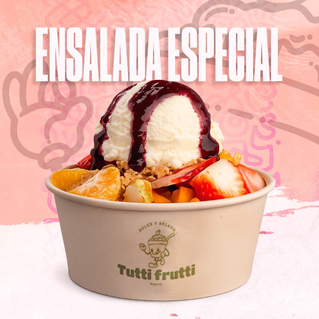 Ensalada súper especial de frutas más dos porciones de helado, preparada con más de doce frutas, aderezada con dulce de mora, crema de leche, queso y granola.
