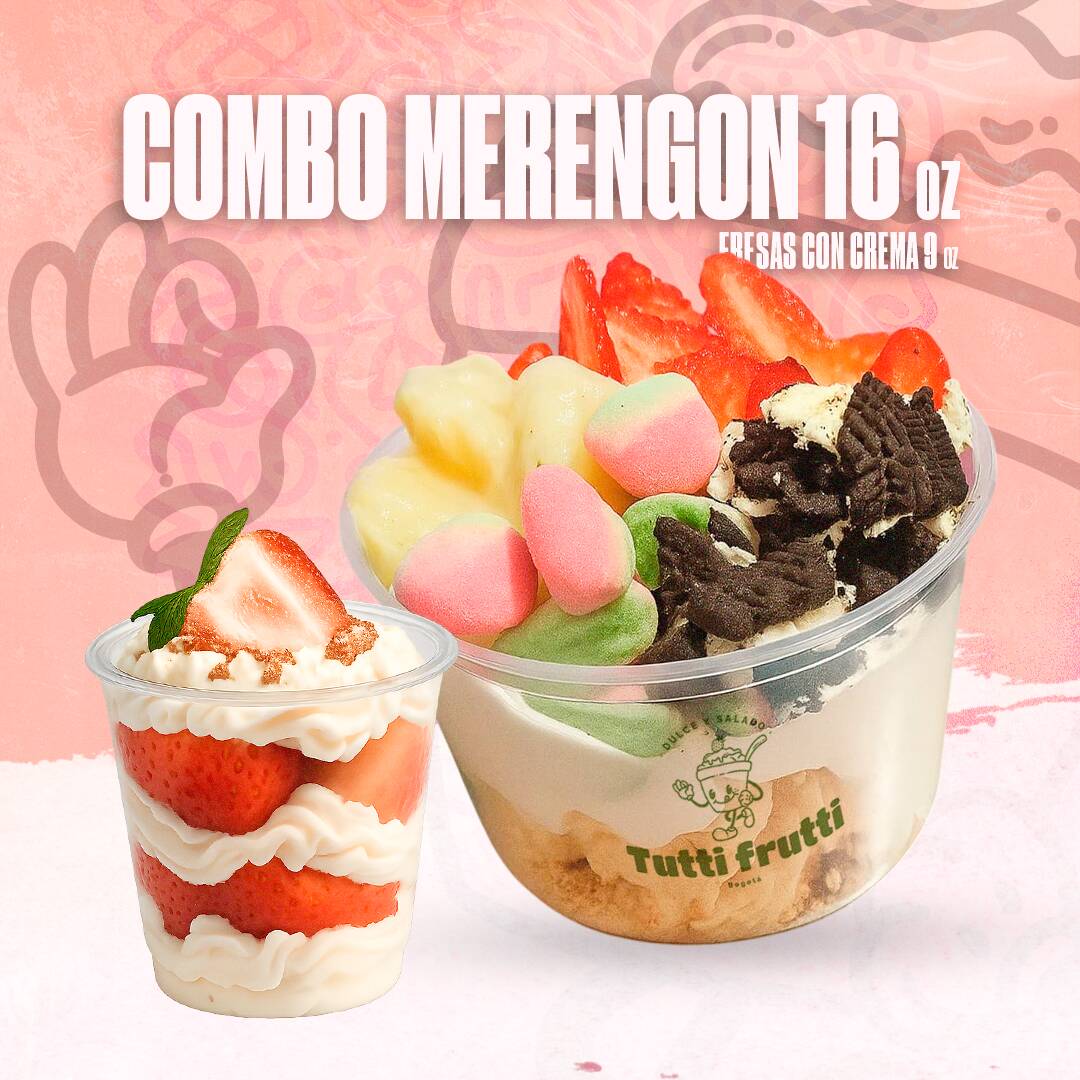 ¡Dúo de postres para endulzar el día! Disfruta nuestro Combo Disfruta con dos cremosos Merengones Premium y unas deliciosas Fresas con Crema. Elige tus 3 frutas favoritas para los merengones y aprovecha este irresistible 20% de descuento.