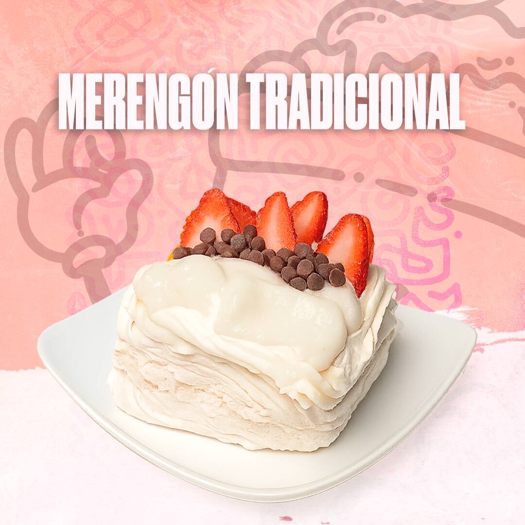 El merengón tradicional es un postre que combina capas de merengue crujiente con una cremosa y densa base, todo coronado con una selección de hasta tres sabores de tu preferencia. Es una explosión de texturas y sabores, ideal para los amantes de los dulces y las frutas.