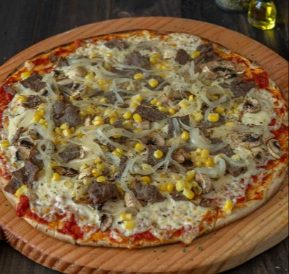 Nuestra Pizza Criolla con sabor local. Carne desmechada y Maíz. Un clásico colombiano.
