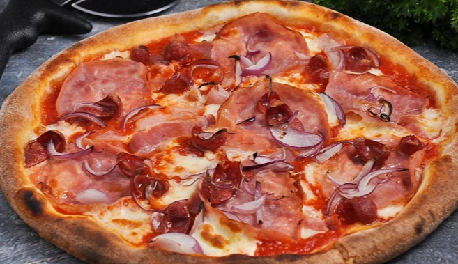 Pizza Española. Chorizo español, champiñón y salami. Un sabor intenso y mediterráneo.