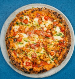 Pizza Gamberetti. Camarón, pollo, cebolla roja y perejil. Una opción gourmet y marina.