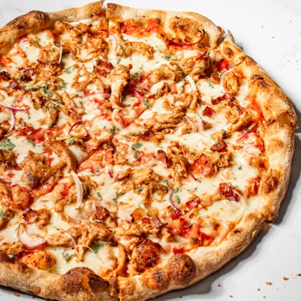 Pizza de Pollo en Salsa BBQ. Jugoso pollo en una salsa BBQ ahumada, con queso fundido.