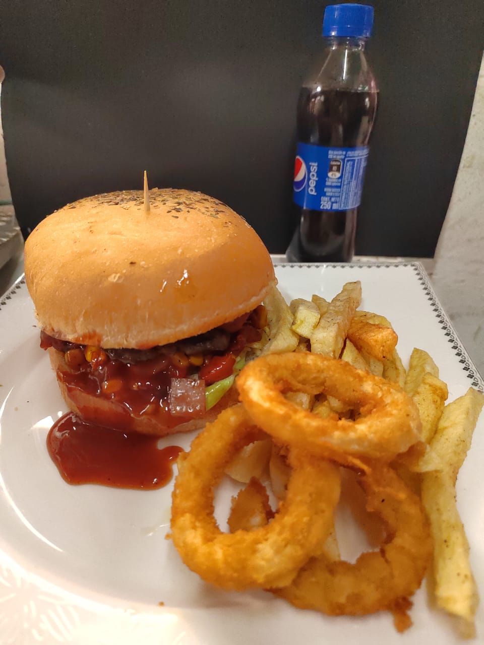 Pan artesanal, carne artesanal, queso cheddar, cebolla chip, papa chip, tocineta, vegetales (tomate, lechuga, cebolla) salsas, acompañado de papas a la francesa y bebida personal