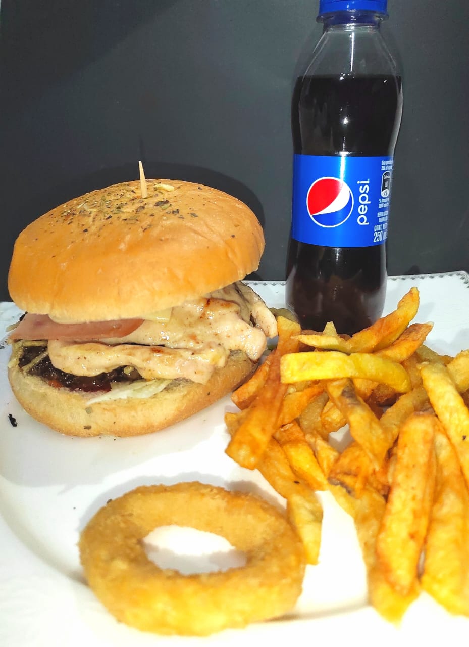 Pan artesanal, media libra de pollo Apanado, tocineta, cebolla chip, vegetales (tomate, lechuga,) papa chip, jamón y queso, acompañado de papas a la francesa y bebida personal
