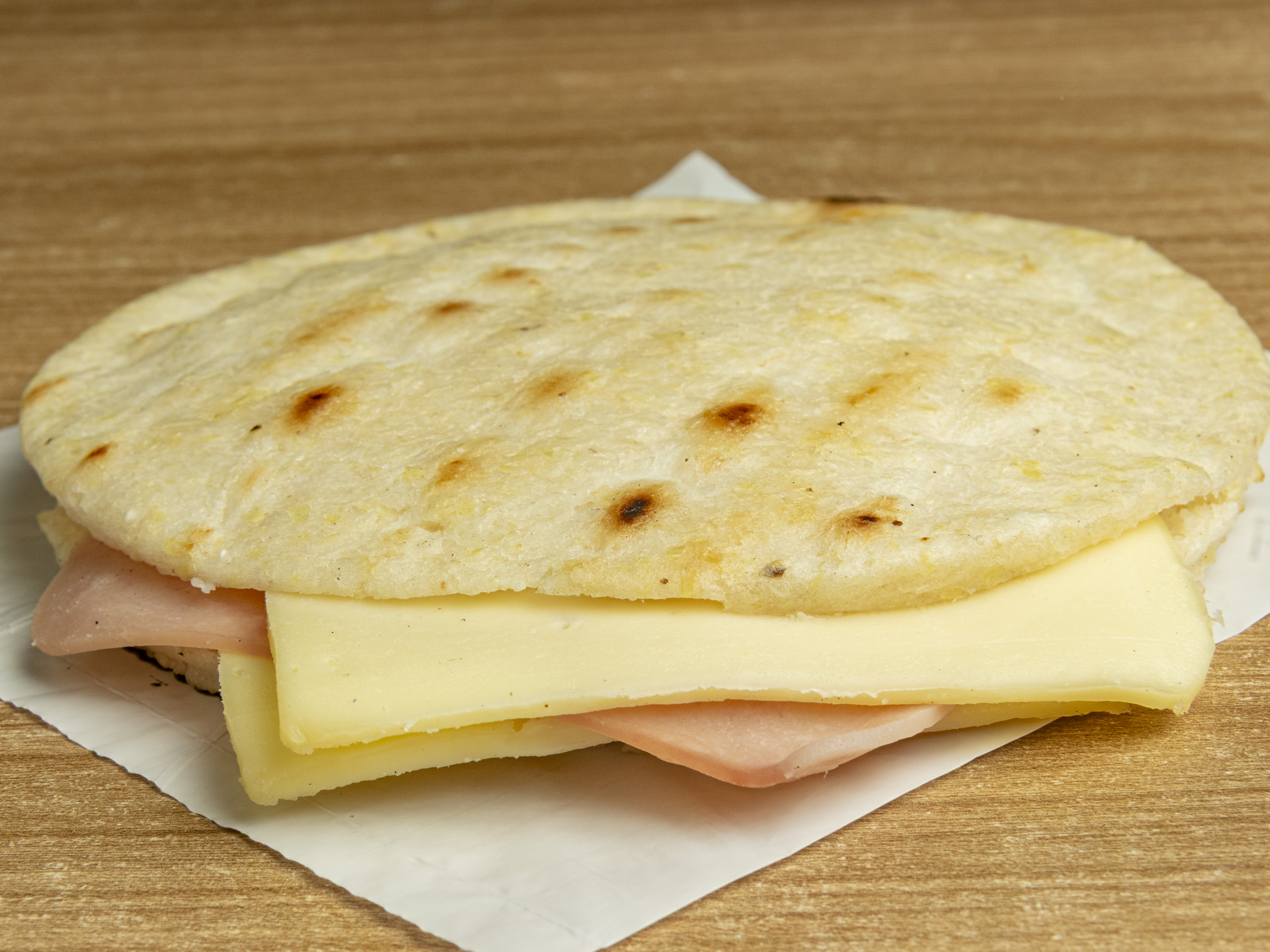 Arepa tostada con doble queso mozzarella y jamón.