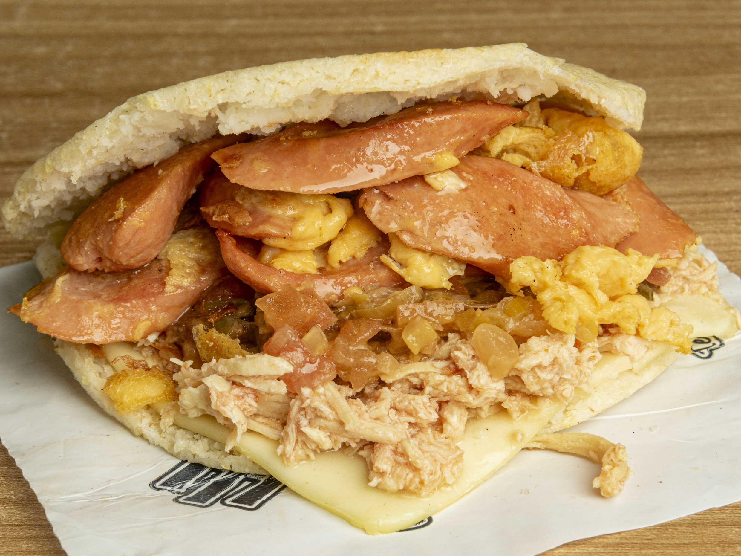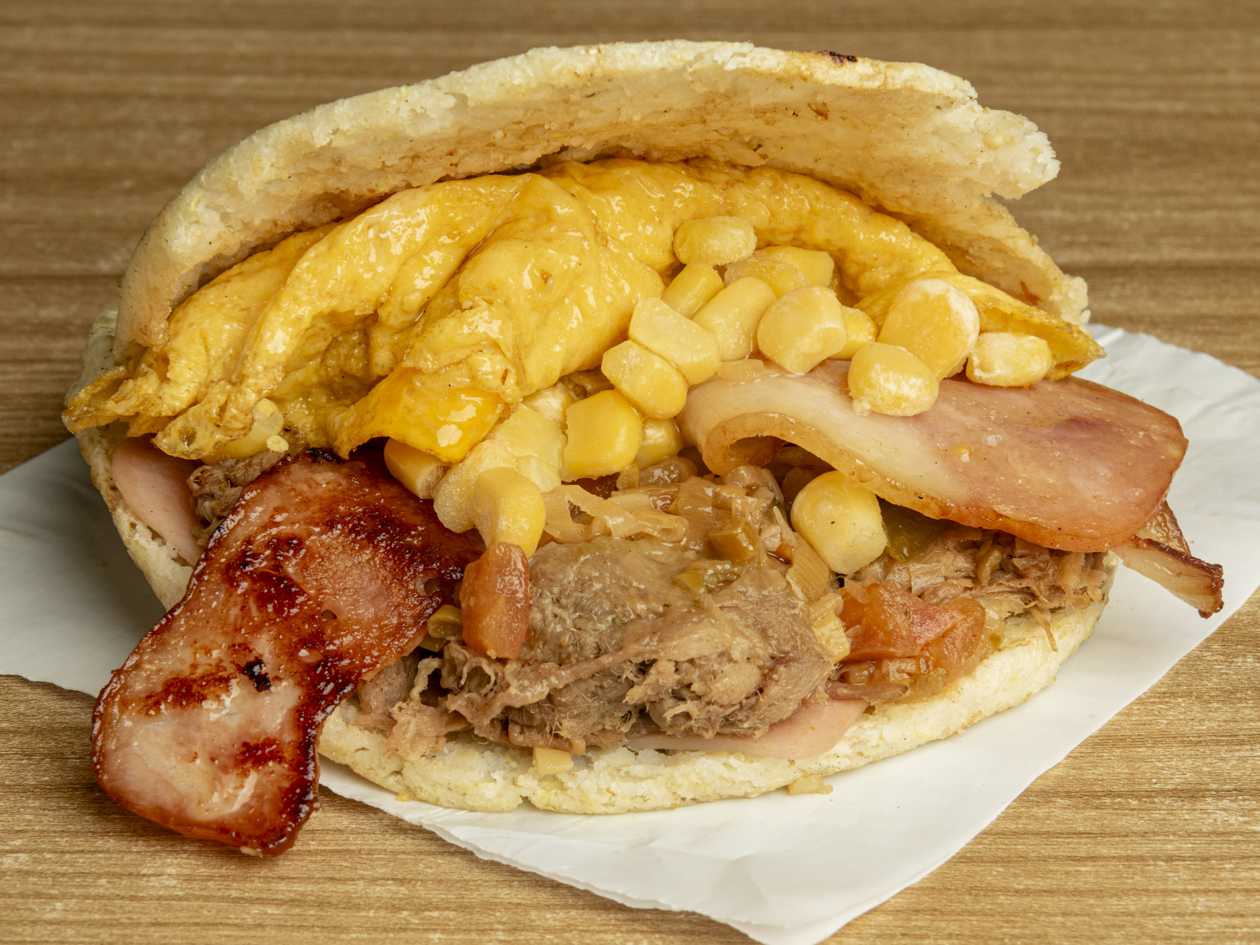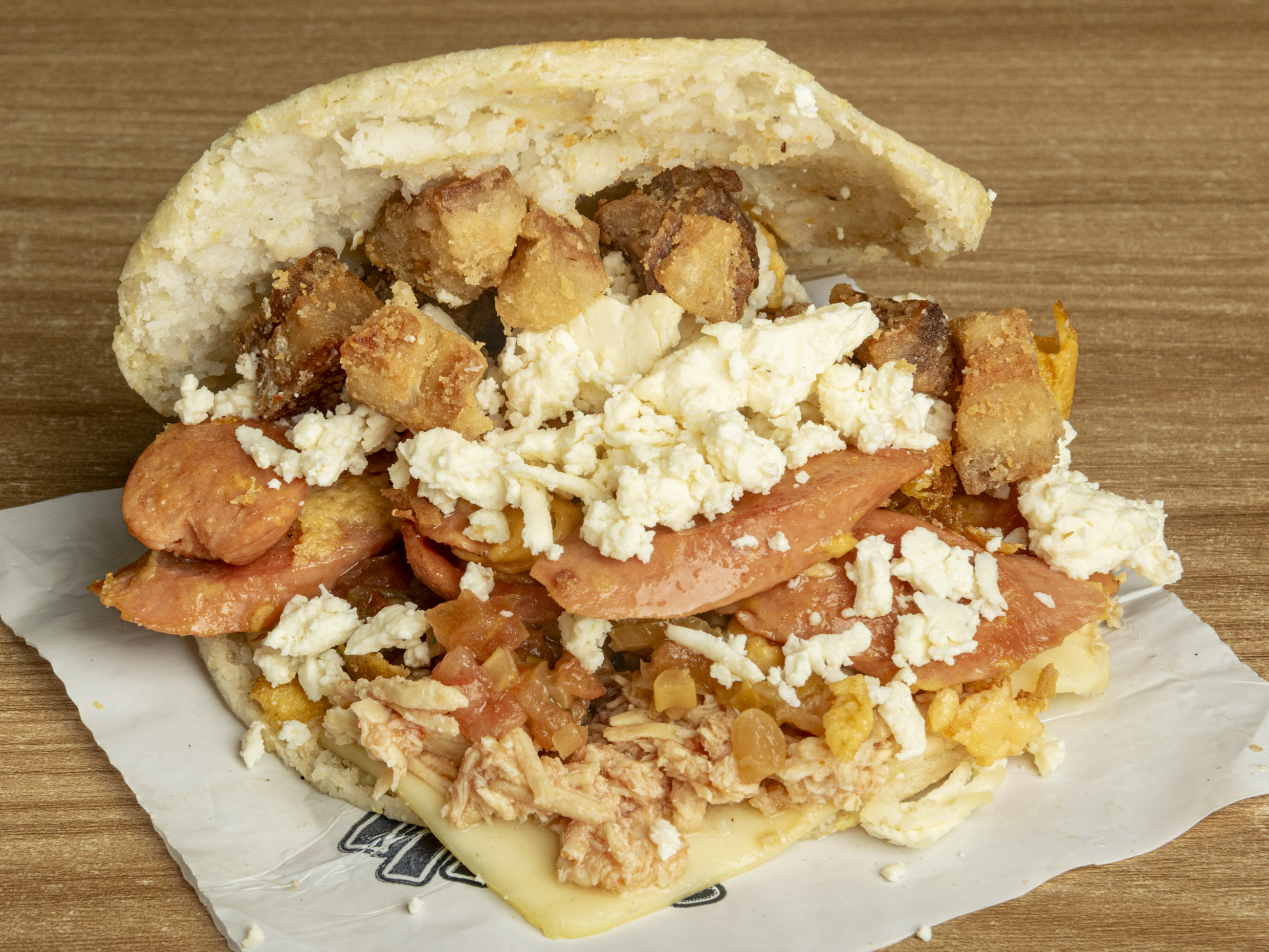Arepa tostada con queso, carne desmechada, pollo desmechado, chicharrón, jamón y extra queso.