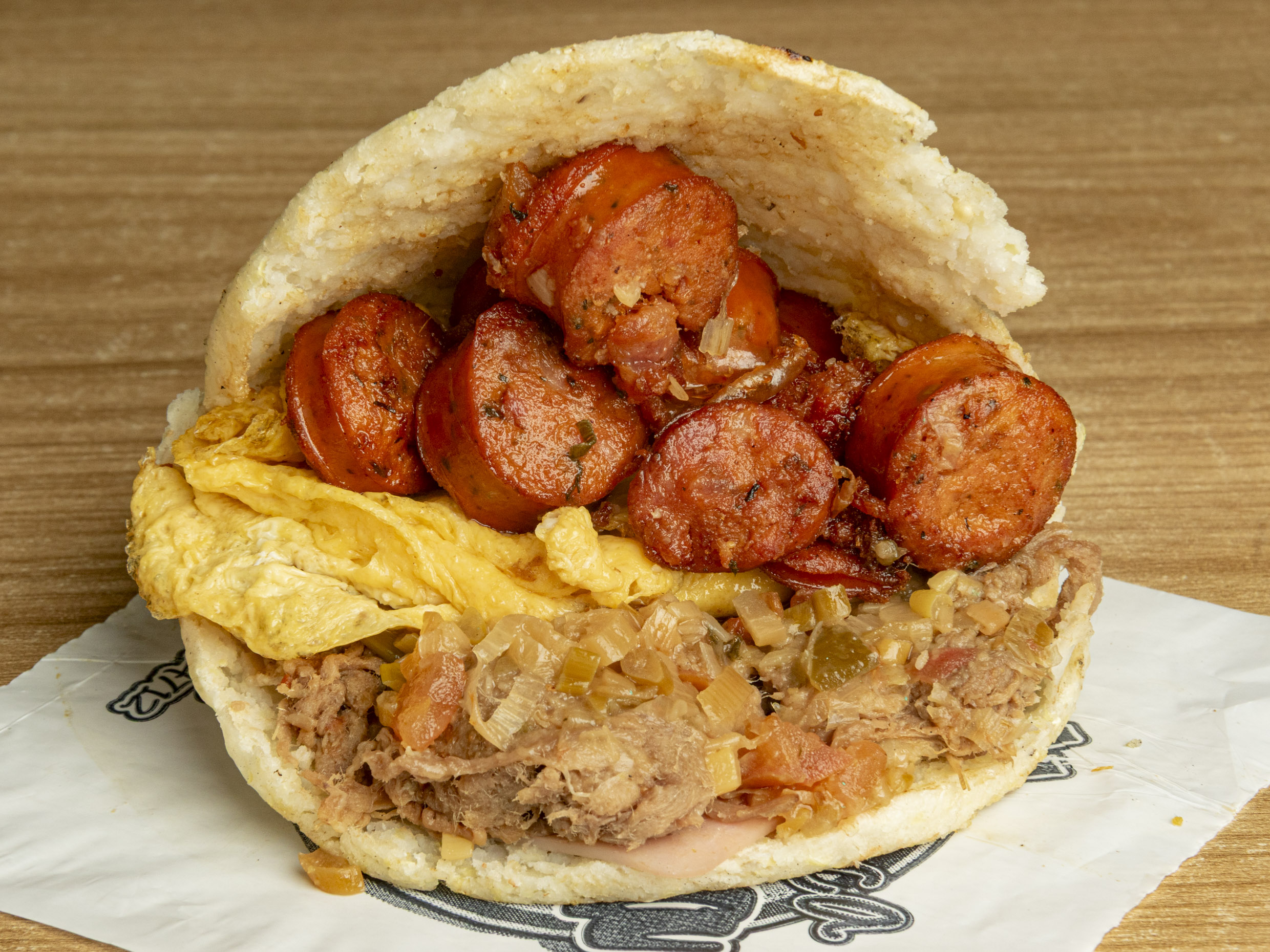 Arepa tostada con carne desmechada, chorizo mixto, queso mozzarella, jamón, huevo y hogao de la casa.