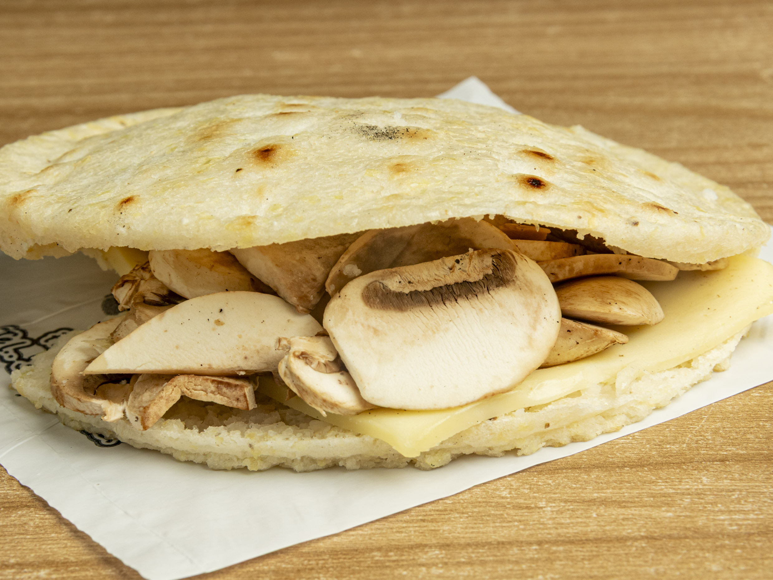 Arepa tostada con queso mozzarella y champiñones salteados en mantequilla.