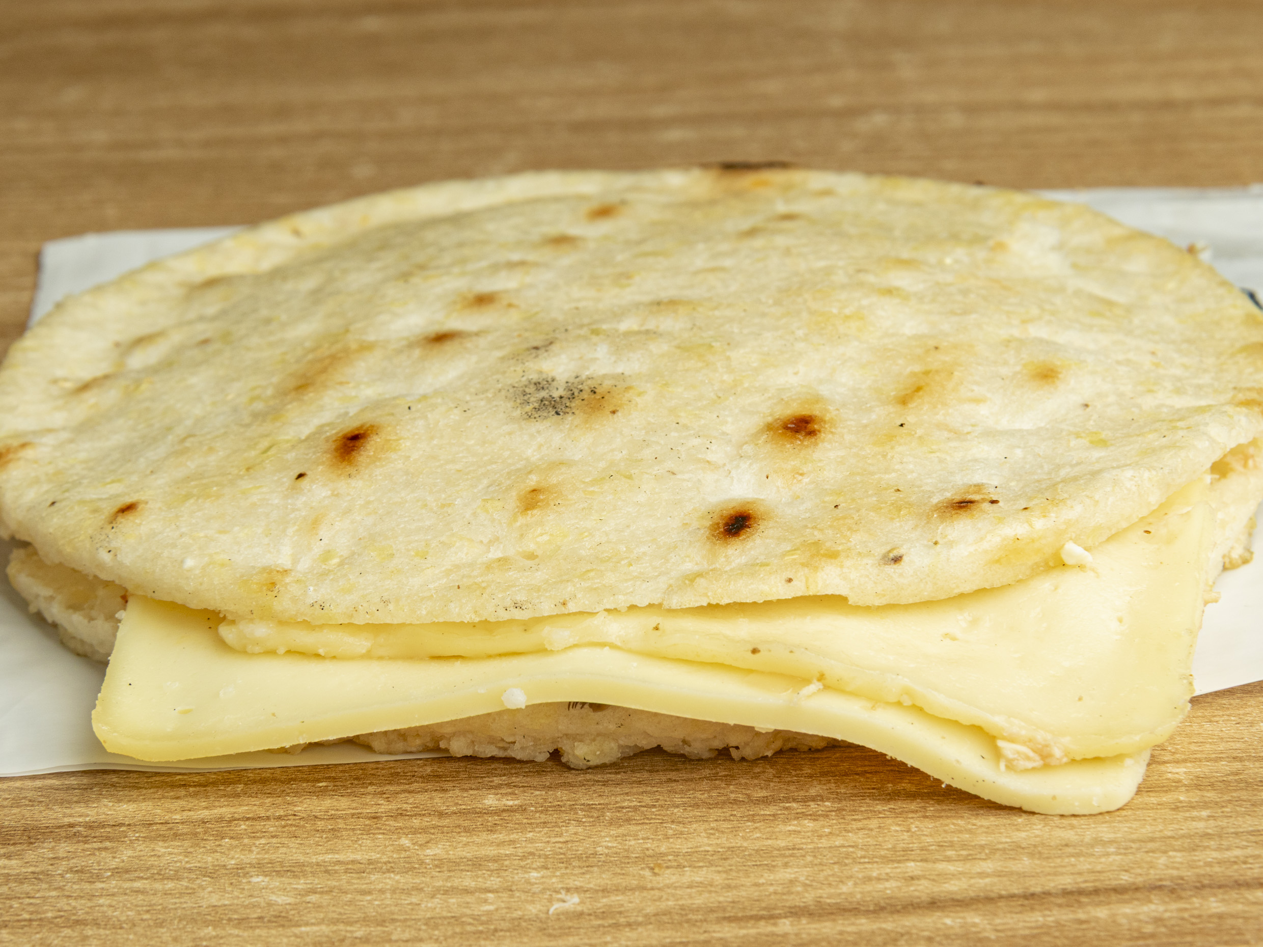 Arepa tostada con doble queso mozzarella.