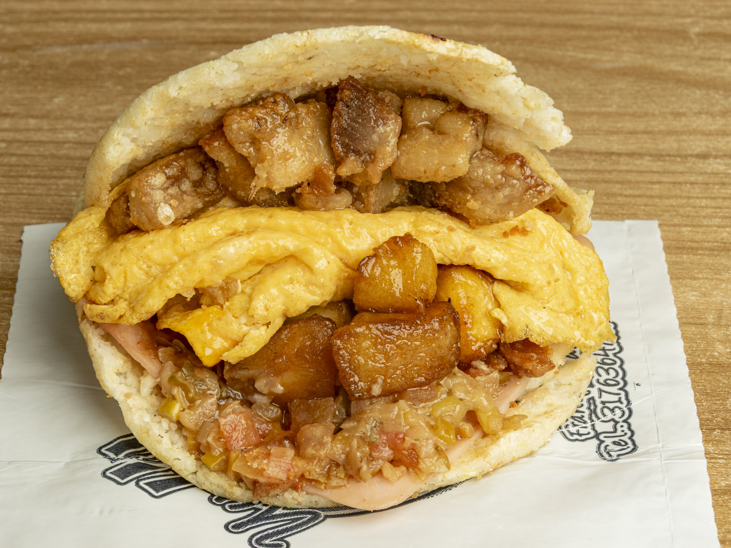 Arepa tostada con carne de hamburguesa 1/4 de libra, queso mozzarella, huevos revueltos, salchicha americana y papitas fosforito.
