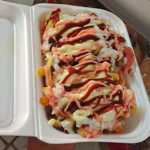 Salchipapa Americana, salchicha long,chorizo, salchicha,jamón,tocineta,queso, huevo codorniz