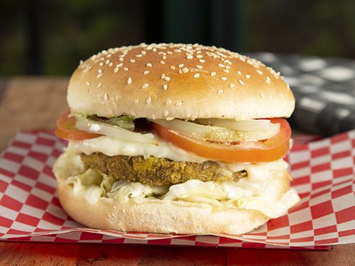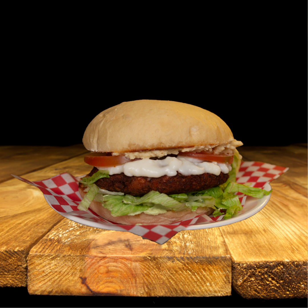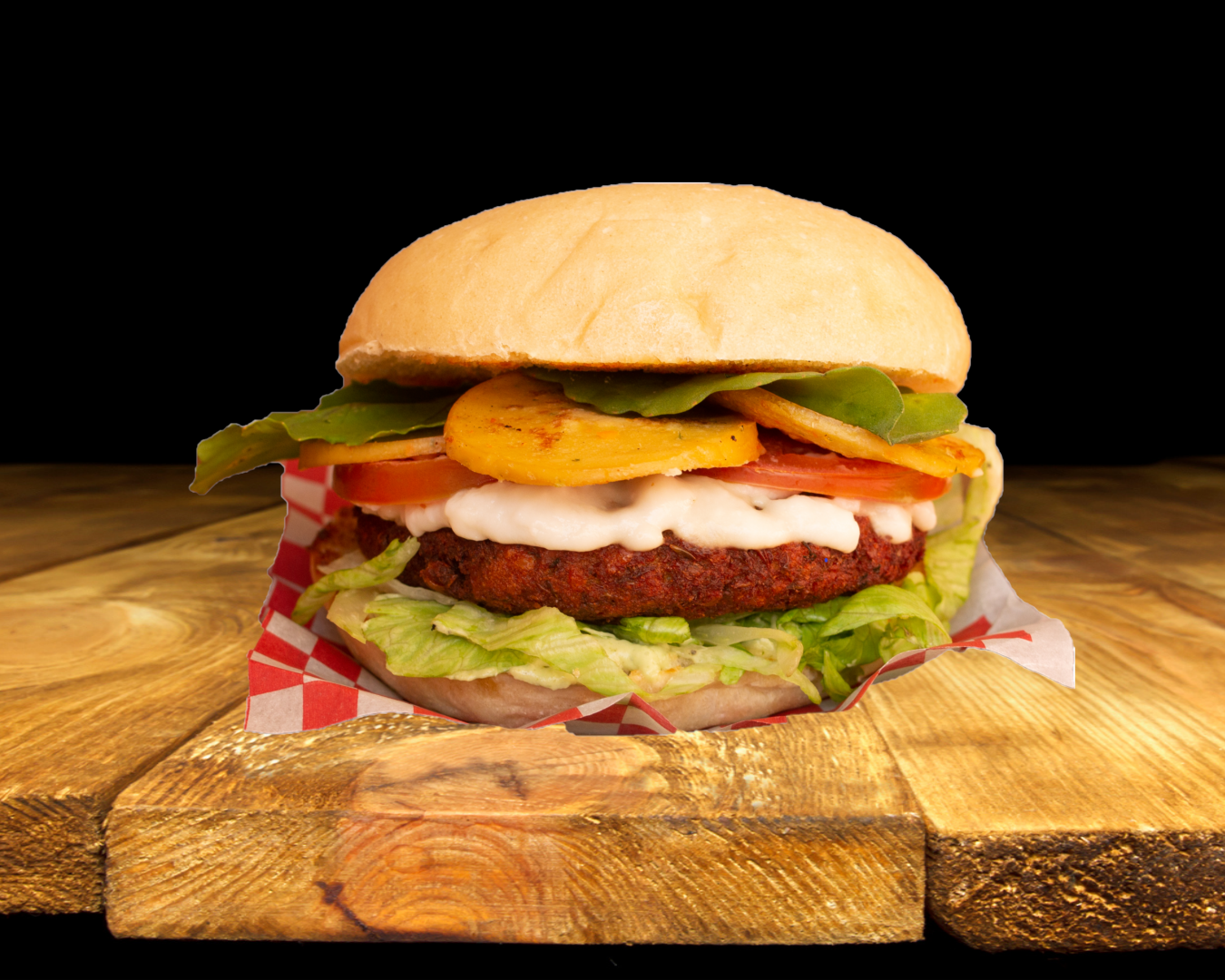 Proteína vegetal, champiñones, cebolla caramelizada, tomate fresco, lechuga, queso vegetal y veganesa de albahaca.