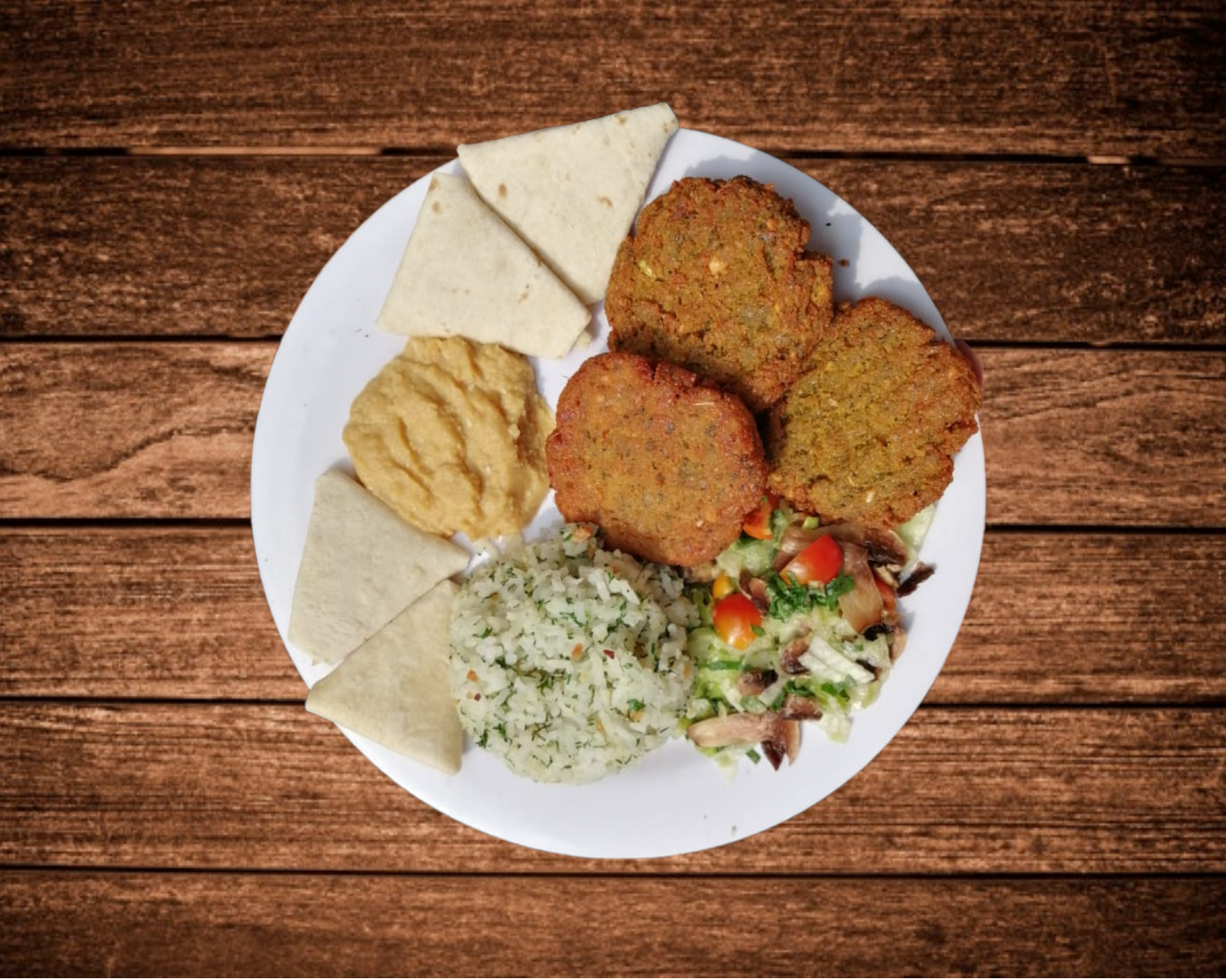 Croquetas de falafel, arroz con cilantro, tahine, torillas y ensalada.