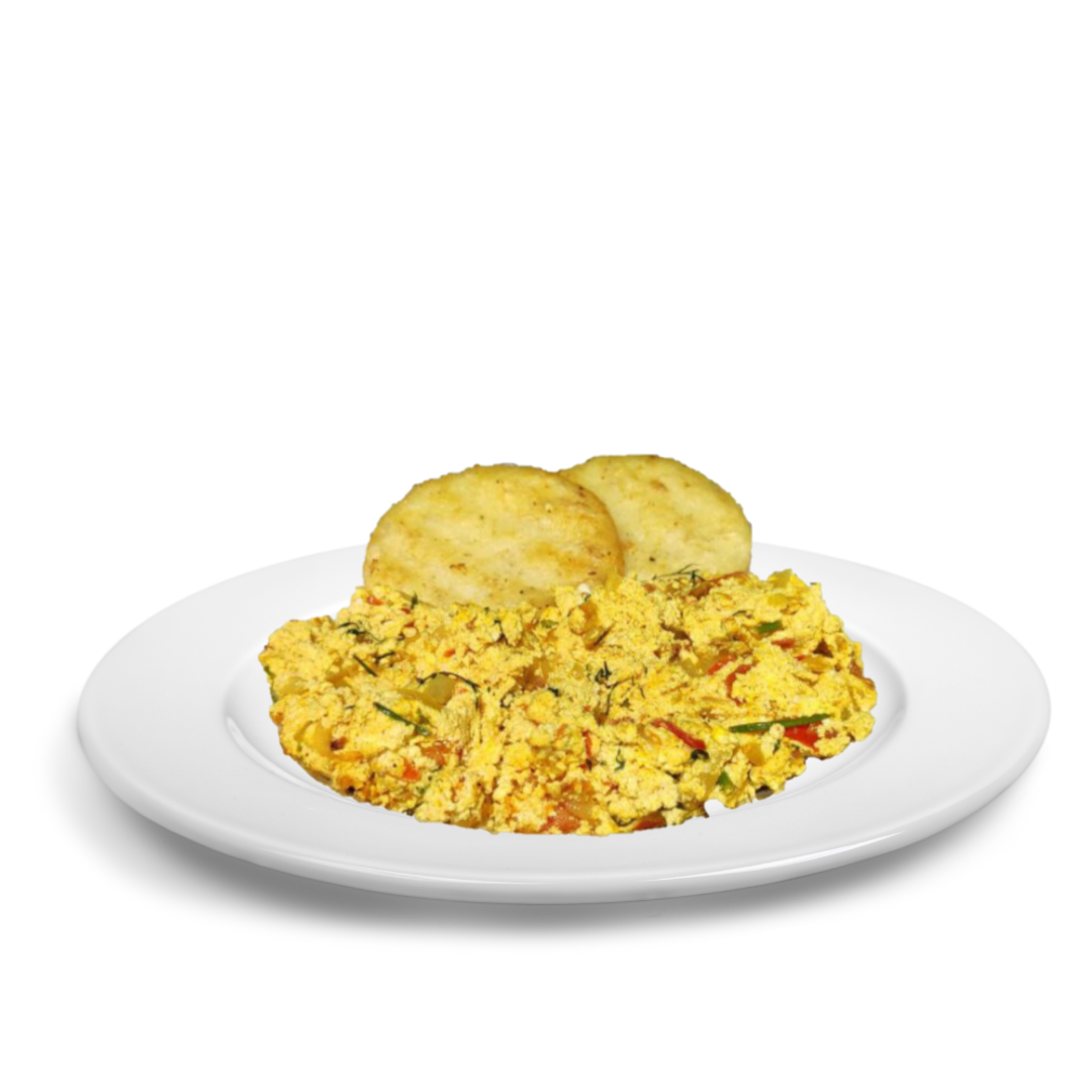 Revueltos de tofu con champiñones, chorizo vegetal, maíz, cebolla y tomate. Acompañados de arepitas