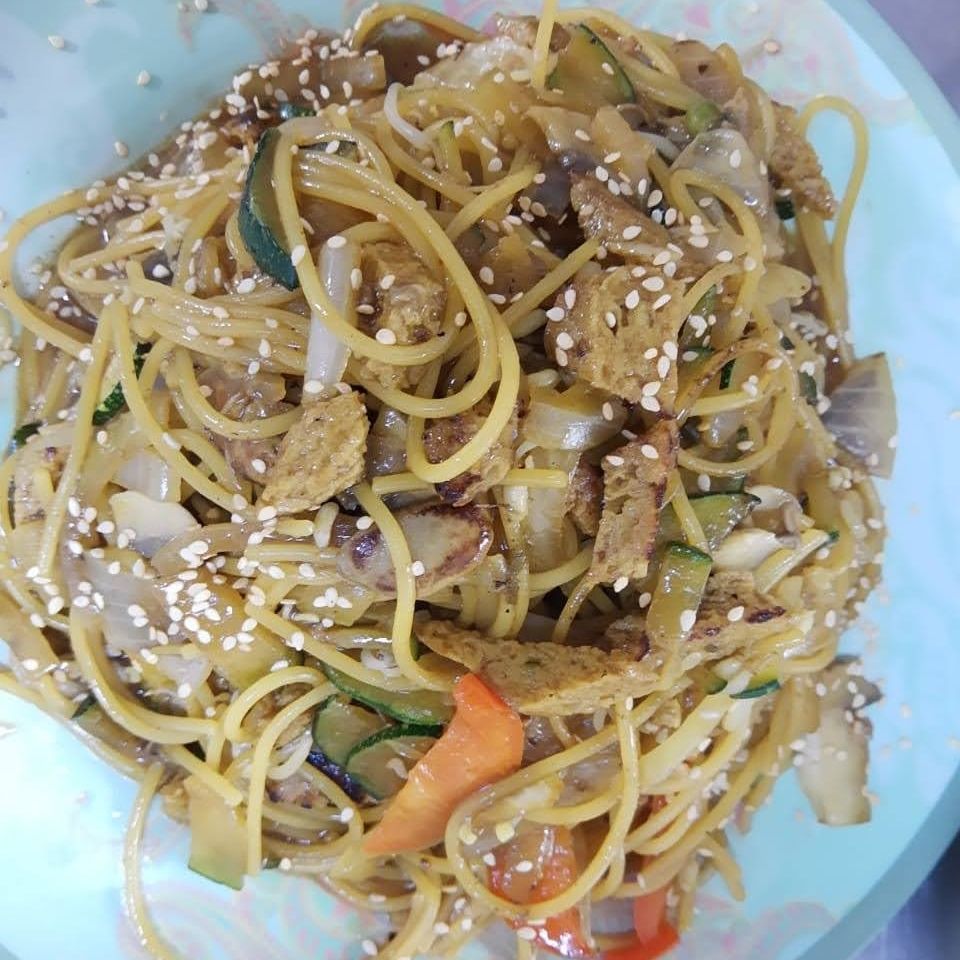 Deliciosa pasta sin huevo, raíces chinas, arveja gourmet, tiras de pimentón, champiñón en láminas, cebolla, tiras de tofu artesanal, tiras de seitán y salchicha vegana. Todo salteado al wok.