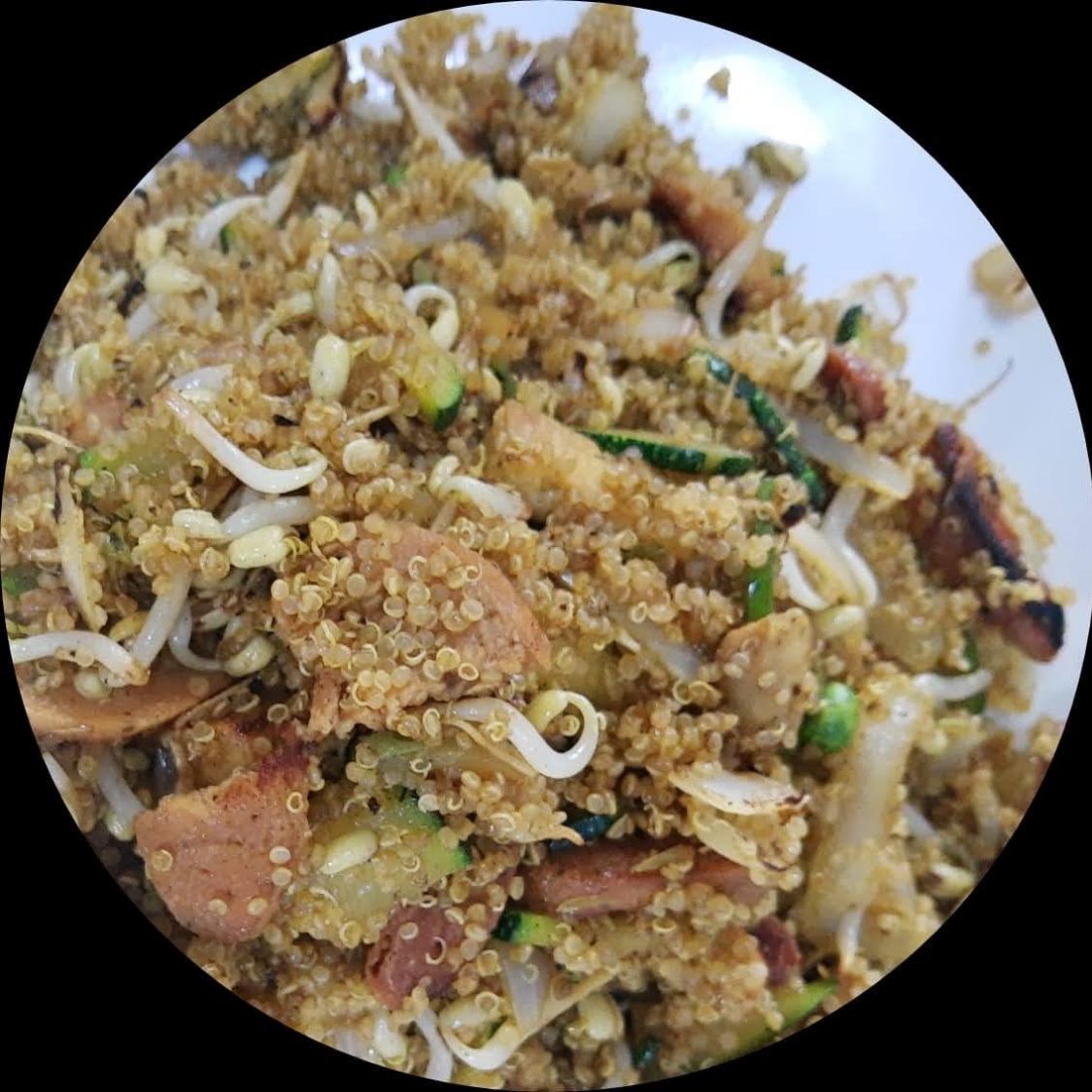 Deliciosa Quinoa acompañada de raíces chinas, arveja gourmet, tiras de pimentón, champiñón en láminas, cebolla, tres proteínas vegetales.