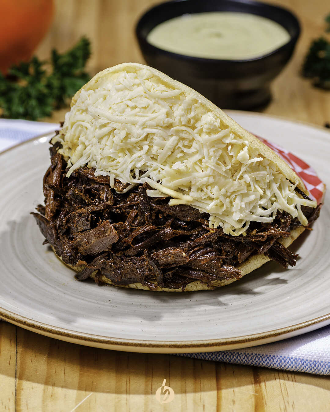 Arepa asada con carne semidesmechada marinada en vino tinto y panela y queso costeño.