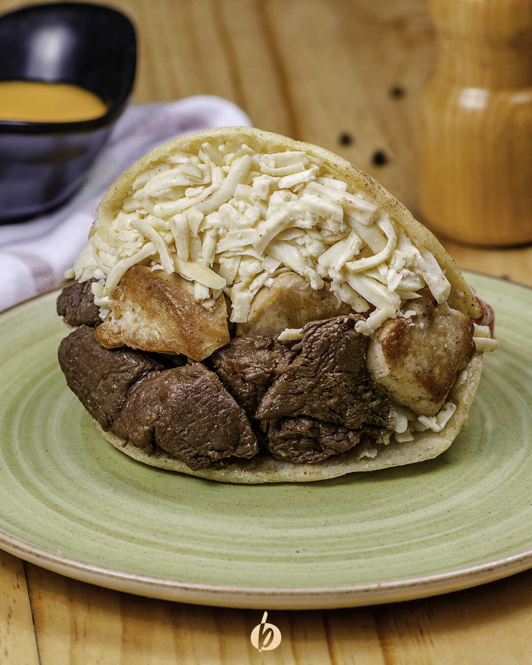 Arepa asada con carne desmechada, pollo desmechado y queso amarillo