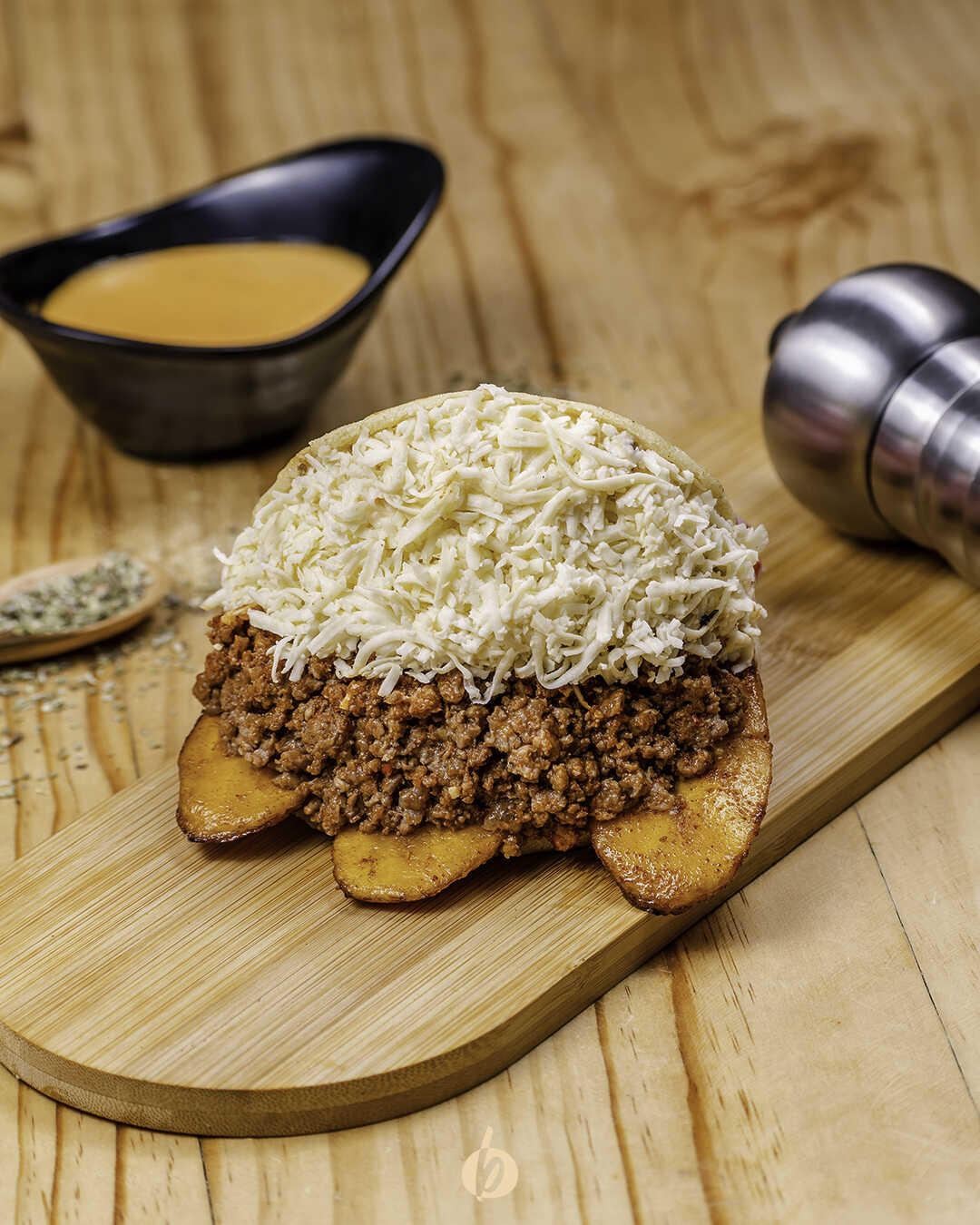 Arepa asada con carne molida, tajadas de maduro y queso campesino.