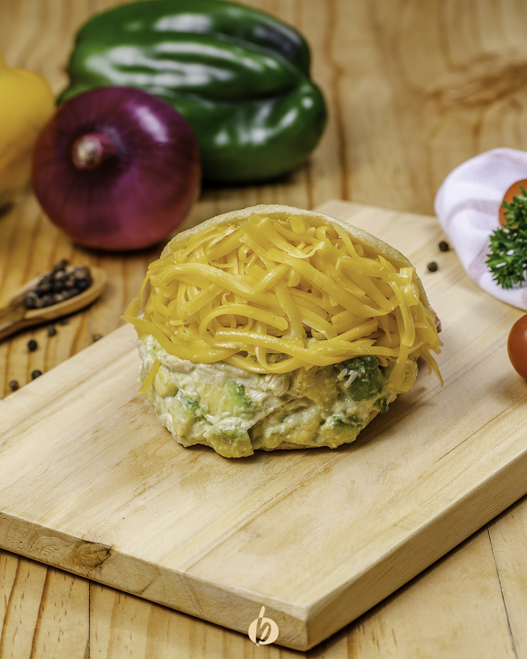 Pollo desmechado y queso amarillo.